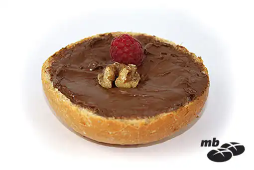 Halbes belegtes Brötchen mit Nutella, Walnuss und Früchtegarnitur.