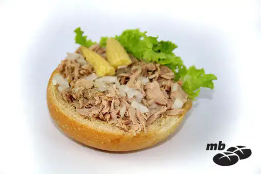 Halbes belegtes Brötchen mit Thunfisch, Remoulade, frischem Salat, gehackten Zwiebeln und Mais.
