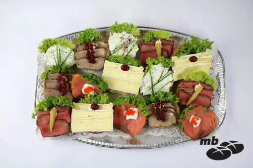Brötchenplatte bestehend aus 15 ausgarnierten halben Brötchen.