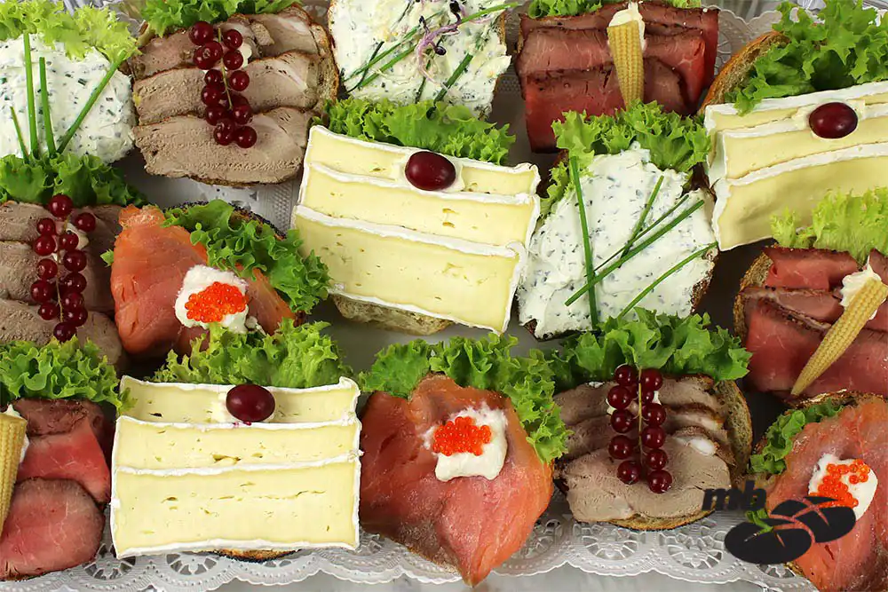 3x Kräuterfrischkäse, 3x Roastbeef, 3x Schweinefilet, 3x Brie, 3x Räucherlachs.