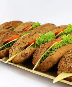 Fitnesstangen belegt mit Emmentaler, Margarine, frischen Salatblättern, Gurke und Tomatenscheiben.