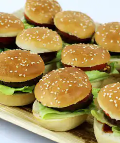 Leckere Mini Hamburger mit Rindfleischpatty, frischem Salat, Tomatenscheiben und BBQ Sauce.