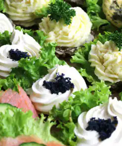 16er Canapes Platte belegt mit Hummus, Frischkäse & Tomatenpesto,
