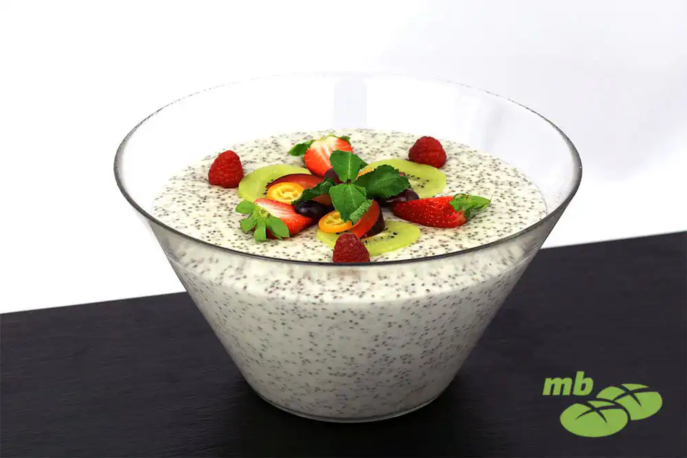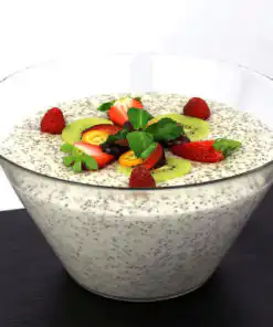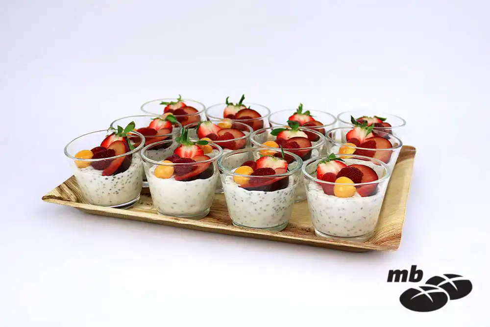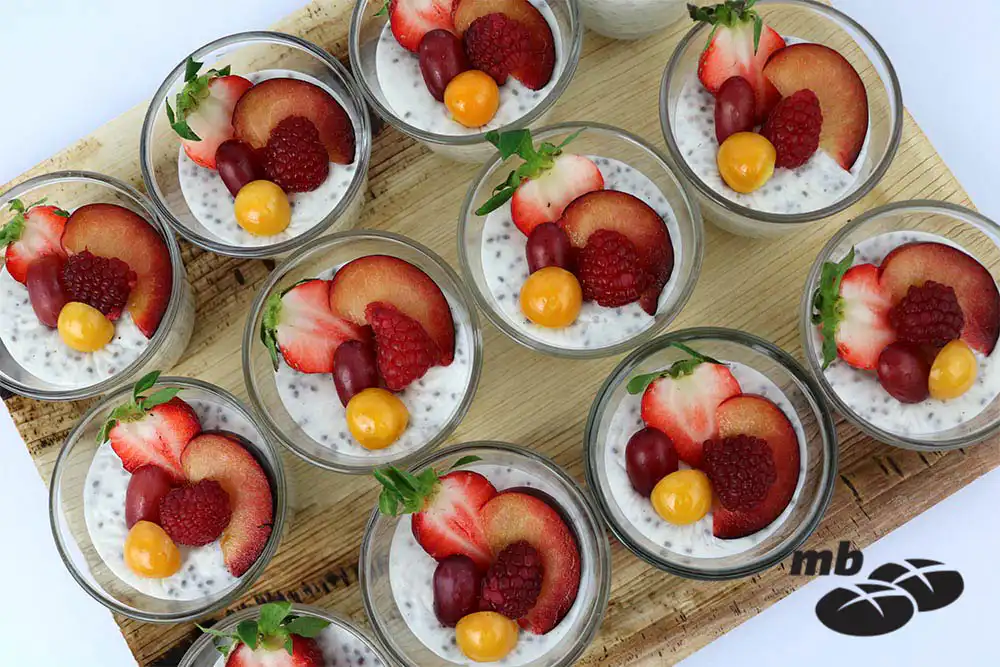 Veganer Chia-Kokos-Pudding garniert mit frischen Früchten.