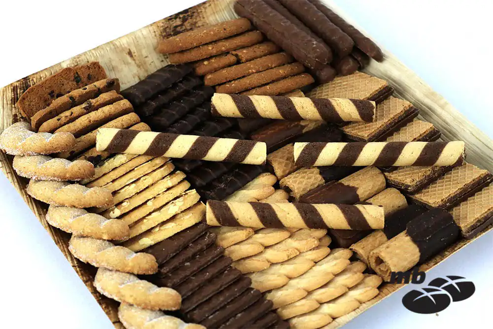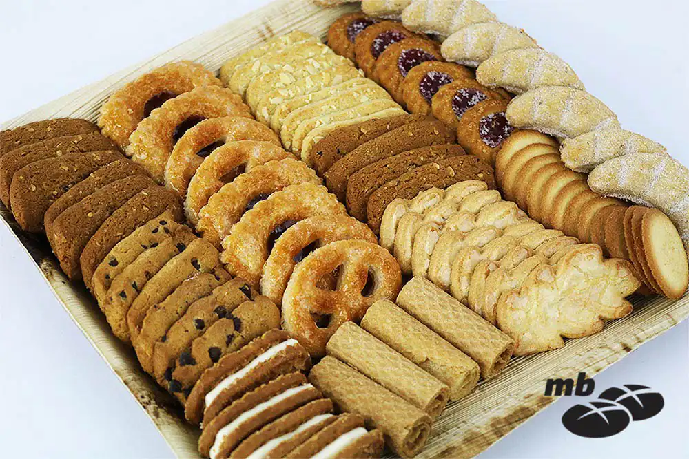 Bunte Gebäckmischung, angerichtet auf Platten.
