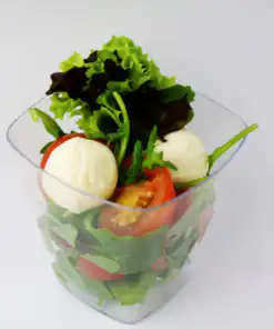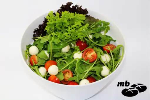 Feiner Rucola gemischt mit kleinen Mozzarellakugeln, Cherrytomaten und Basilikum, verfeinert mit Olivenöl und Meersalz.