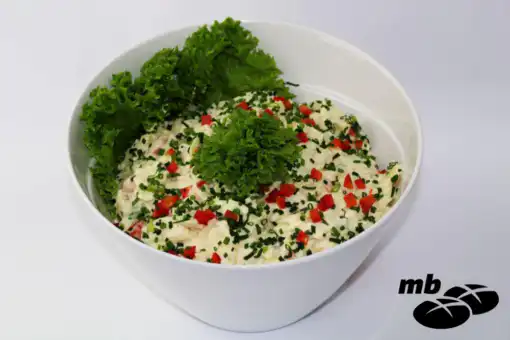Regionale Kartoffeln mit gekochten Eiern, sauren Gurken, Paprika und verfeinert mit Schnittlauch in cremiger Mayonnaise.