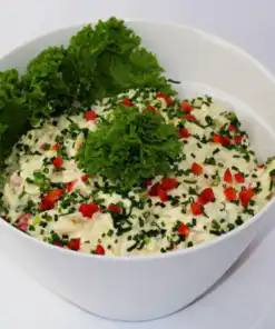 Regionale Kartoffeln mit gekochten Eiern, sauren Gurken, Paprika und verfeinert mit Schnittlauch in cremiger Mayonnaise.