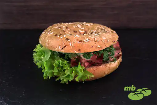 Belegter Mehrkornbagel mit Roastbeef, Remoulade und Kresse.