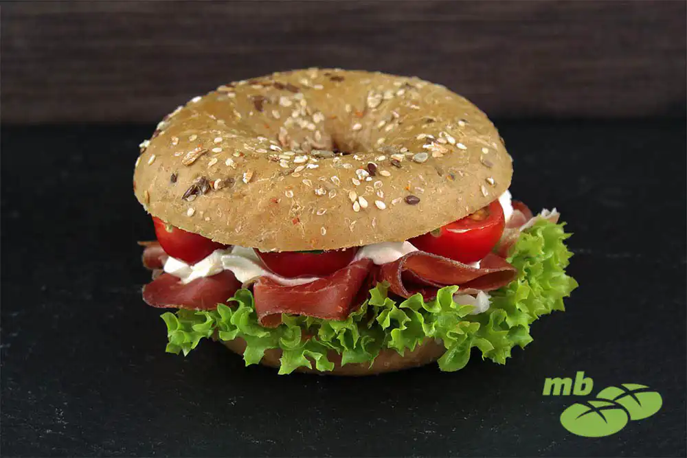 Belegter Mehrkornbagel mit Serrano Schinken, frischem Salat, Frischkäse, Cherrytomate und Rucola.